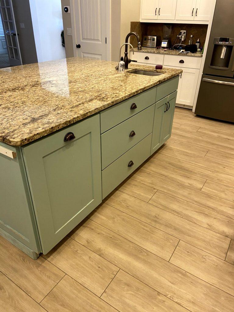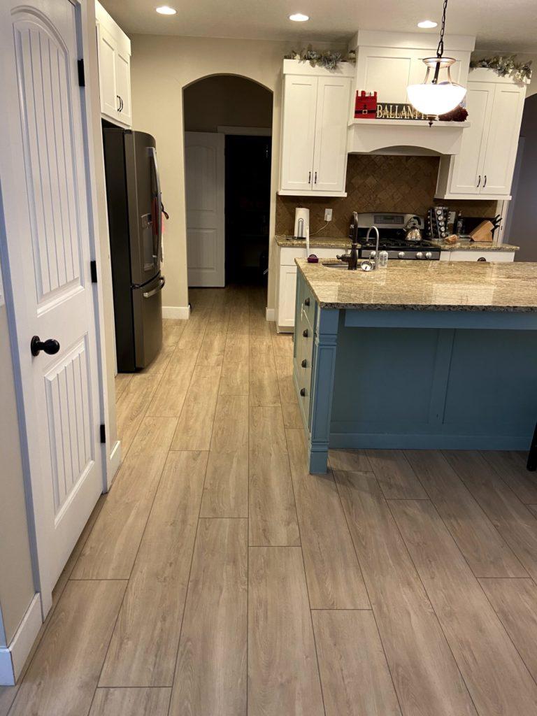 This client needed new flooring in their kitchen, dining room, and entryway. They selected a light brown LVP that looks spectacular with their kitchen cabinet and countertop coloring!
